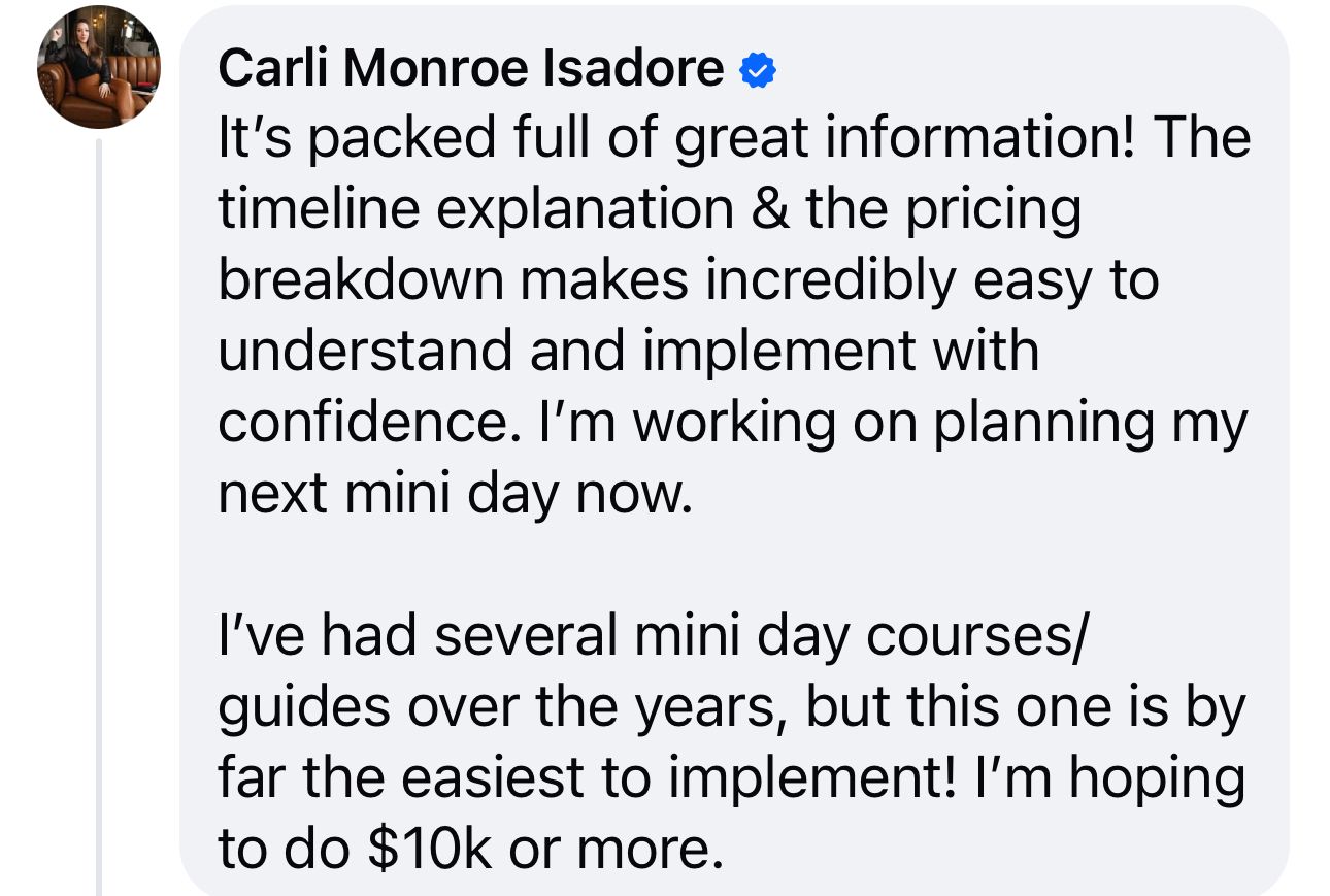 Templates, tools, and checklists to run a stress-free, highly profitable Mini Day.